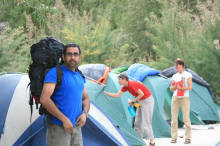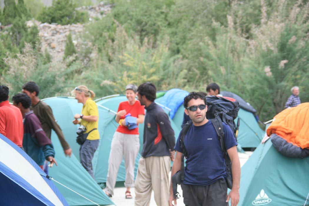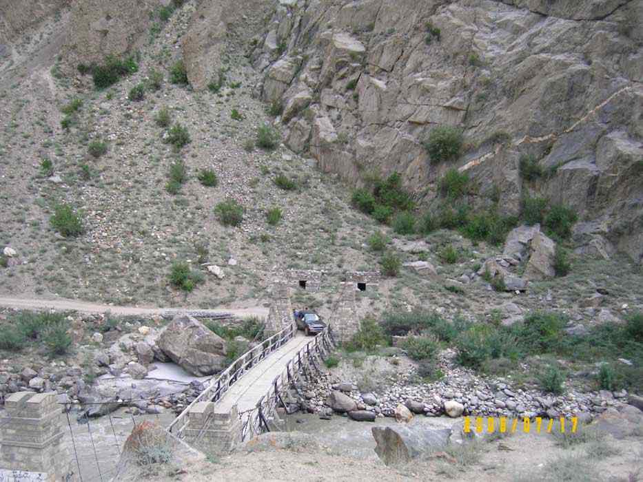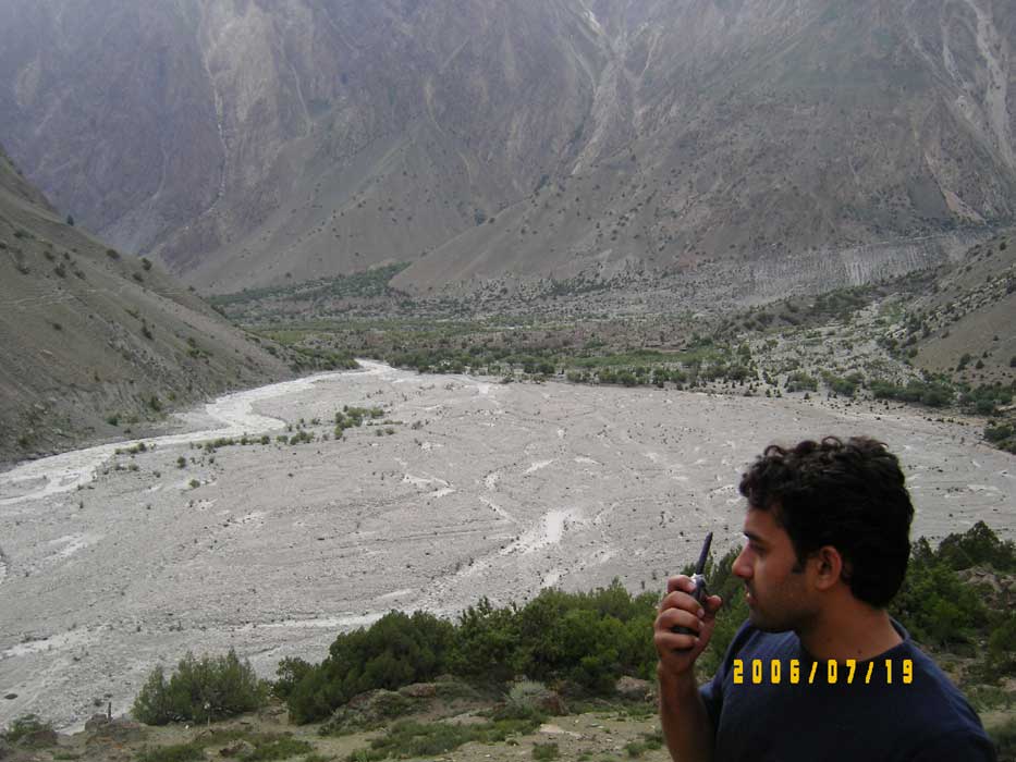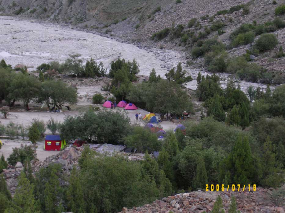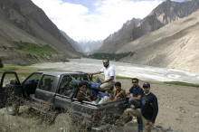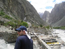 Khaplu to Hushey valley: Khaplu is a last town before Hushey valley. Jeep track starts right after khaplu which is narrow, mudy and rough. Don not drive your own vehicle cause it can be very dangerous in rain because of mud and altitude. Hire a local jeep from Khaplu (Jeep fair Rs. ___in 2006 for both ways) and make sure you complete your all shopping in khaplu. Khaplu town is good in size and almost every thing is available there i.e. grocerry, oil, gass cylinders, batteries, food, 2nd hand tracking equipment, transport - public, local & private etc. TDPC hotel in Khaplu is newly constructed and very beautiful, we did not stayed there but parked our jeep there for 4 days. ( room rent in year 2006 for double bed approximately Rs 1400/- to 1800/- and is negotiable). A broken bridge at Kanday village was temporarily repaired by the locals, they charge Rs 500/- (both ways) per vehicle from the Pakistanis and Rs.1000/- (both ways) per vehicle from the foreighners. |