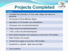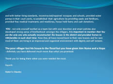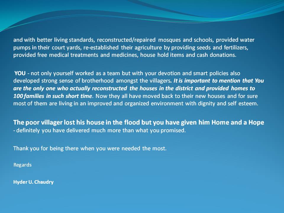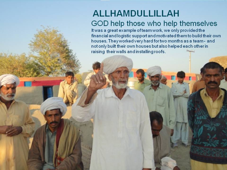 You have Delivered what you Promised Dear All, Congratulations! I want to congratulate you all, on successful completion of reconstruction project in Rajanpur district. It was a great team effort of individuals and groups with one passion in common – to help the nation. After the successful relief operations in various destroyed villages of district Layyah and Rajanpur, it was decided to start the reconstruction and rehabilitation phase. With no experience of construction, it was definitely a big challenge for all of us. Mr. Atif Ali took the responsibility as Project Manager. After the detailed surveys and meetings with various government, private organizations and NGOs three different villages of Mohammadpur (South East of Rajanpur) i.e. Tharri Walla, Shah Walli and Bastti Rinda were selected for reconstruction and rehabilitation. In a short period of just 90 days, with the grace of Almighty, we have achieved and delivered what we planned and promised to hundreds of people, who were forced to live a life full of tears, starvation, disease, homelessness and misery. With your generous donations, extensive hard work, excellent coordination and above all a highly systematic approach, we have successfully reconstructed a completely destroyed village of Thari walla, reconstructed approximately 100 houses in different three villages with improved facilities and with better living standards, reconstructed/repaired mosques and schools, provided water pumps in their court yards, re-established their agriculture by providing seeds and fertilizers, provided free medical treatments and medicines, house hold items and cash donations. All volunteers - worked as a team and with their devotion and smart policies also developed strong sense of brotherhood among the villagers. It is important to mention that We are the only one who actually reconstructed the houses in the district and provided homes to 100 families in such a short time. Now they all have moved back to their new houses and for sure most of them are living in an improved and organized environment with dignity and self esteem. The poor villager lost his house in the flood but you have given him Home and a Hope - definitely you have delivered much more than what you promised. Thank you for being there when you were needed the most. for n behalf of Final Report on the Project |